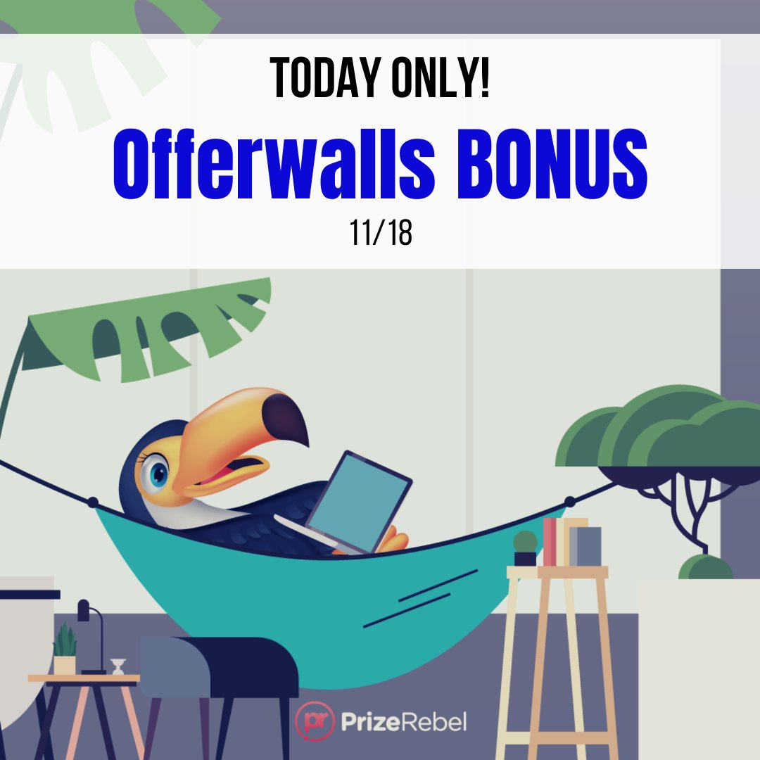 Earn BONUS points on Offerwalls 11/18 only on PrizeRebel.